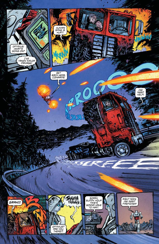 Written and illustrated by Johnson and colored by Mike Spicer, Transformers #4 is due to hit shelves this coming January. The issue features a main cover by Johnson and Spicer, as well as a wraparound variant cover by Jonboy Meyers, a connecting variant by Orlando Arocena, a variant by Sanford Greene, and a spoiler variant by Andrea Milana and Annalisa Leoni. In addition to the covers, Skybound has shared four fully-lettered preview pages from Transformers #4. In these pages, the villainous Starscream pounces on a battle-damaged Optimus Prime, who is carrying a badly-injured Spike Witwicky. Fortunately, Carly and Cliffjumper are on hand to make the save.