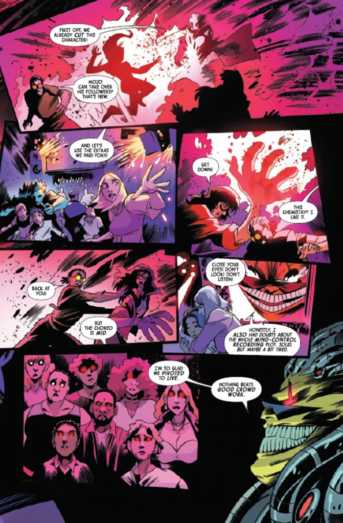 Written by Jackson Lanzing and Collin Kelly, with art by Michael Shelfer, NYX #6 finds the cast attending a Dazzler concert. However, what promises to be a fun evening is put on hold when they spot the Mutant technopath Local lurking. Sure enough, Local is shown to be in the employ of the extradimensional media mogul Mojo. Their plan is to enthrall the crowd, turning them into slaves of Mojo. To make matters worse, Mojo displays a new found ability for direct telepathic control rather than the subliminal brainwashing he employed in the past. Thankfully, when the mob turns on Kamala Khan, Laura Kinney and company, they get some unexpected help.