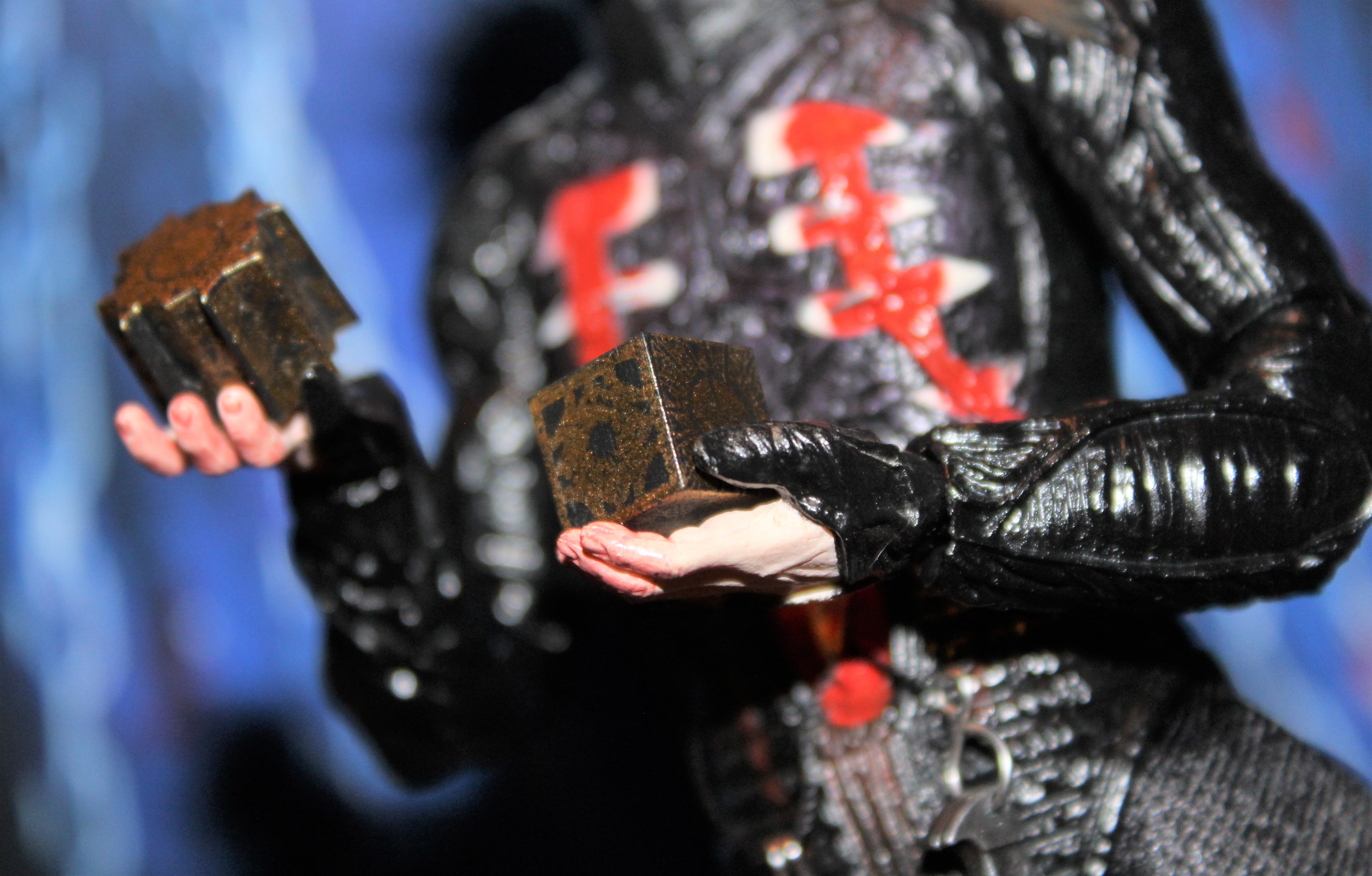His three weapons — hook, knife, and hacksaw — hook on to the string that runs through his pierced navel. He can also hold them, though only the hook fits snugly in his hands. Speaking of, he has three sets: weapon-holding, closed-box holding, and open-box holding. Both versions of the Lament Configuration puzzle box are small but nicely detailed.