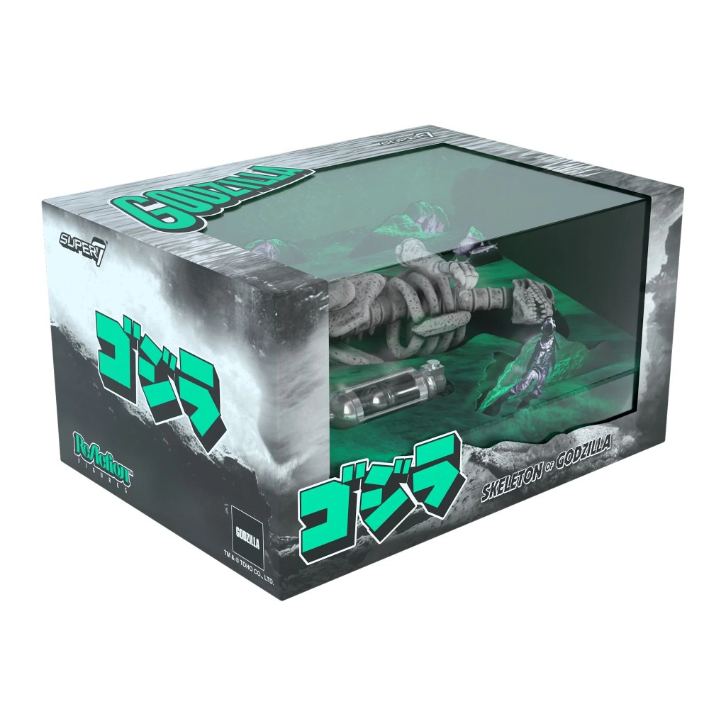 Super7 has more somber advice, saying, “Packaged in a diorama-style box that displays Godzilla’s de-fleshed carcass in a watery grave, the Skeleton Godzilla ReAction Figure will be a sobering reminder of both man’s capacity for destruction and Godzilla’s ability to overcome even the most dire circumstances.” (Don’t start an argument with them about whether or not the subsequent movies were about a different Godzilla, and therefore the original did in fact stay dead. It’s not worth it.)