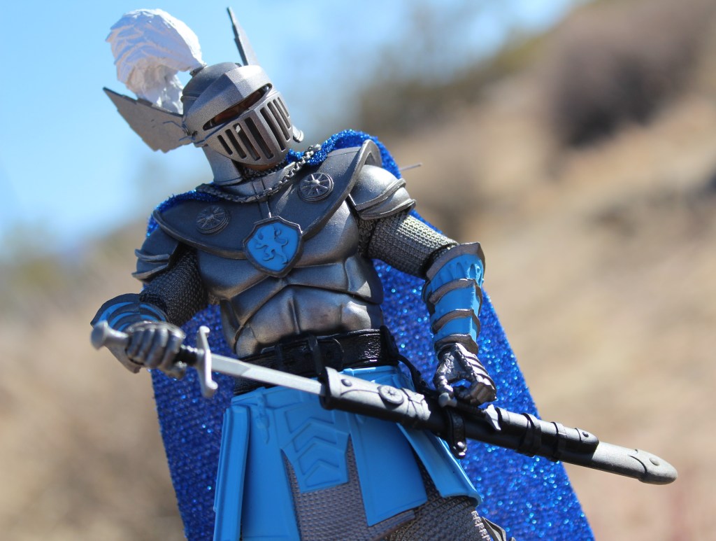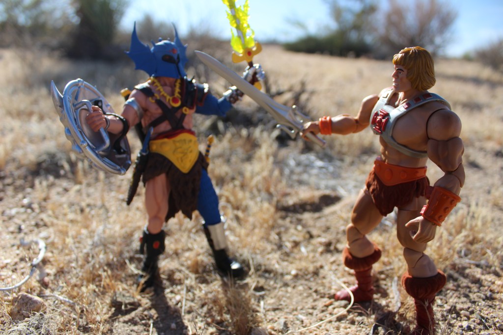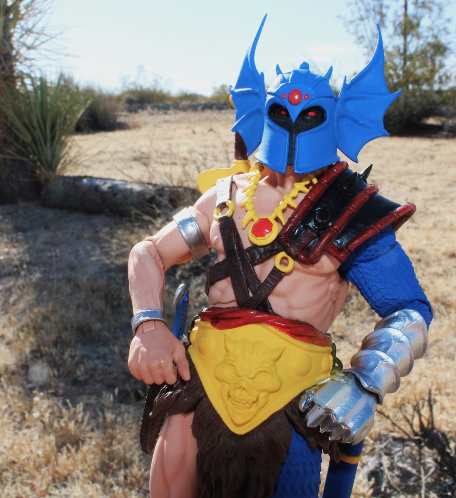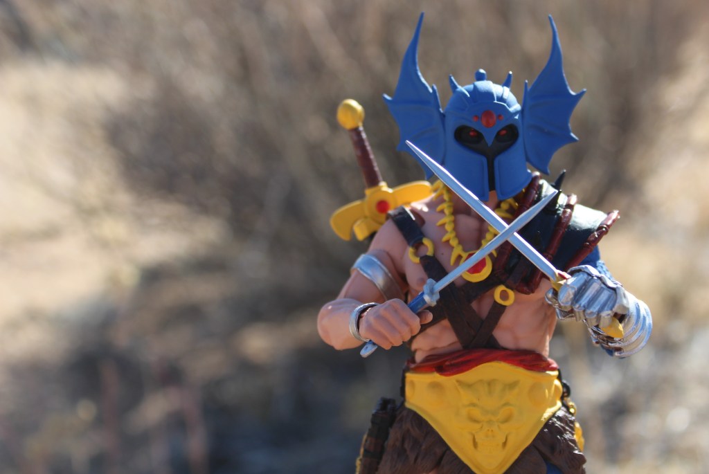 NECA sent us the first two for review, Warduke and Strongheart. Representing good and evil, they represent the classic fantasy archetypes of noble knight versus savage gladiator. Toy makers in the ’80s, on the whole, tried to make all their characters pop on the shelves with bright colors, so Warduke, like Cobra Commander, has a prominent blue helmet to hide his face. Strongheart’s cassic armor is silver, but with baby blue highlights that feel more decorative than dangerous (sorry, UNC Chapel Hill fans!). The first NECA Strongheart had a more tailored cape; the new one gets a light piece of fabric with sparkles in it. Flimsier, but more sun-catching.